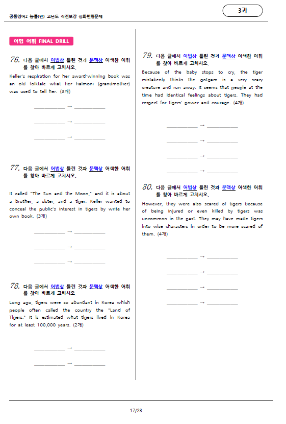 7. ์ด๋ฒ, ์ดํ Final Drill : ์ ์ฒด ์ง๋ฌธ์ ๋ฌธ์ฅ ๋จ์๋ก ์ชผ๊ฐ ํ ๊ฐ ๋ฌธ์ฅ์ ๋ค์ด์๋ ์ด๋ฒ์, ๋ฌธ๋งฅ์ ํ๋ฆฐ ๊ฒ ์ฐพ์ ๋ฐ๋ฅด๊ฒ ๊ณ ์ณ์ฐ๊ธฐ