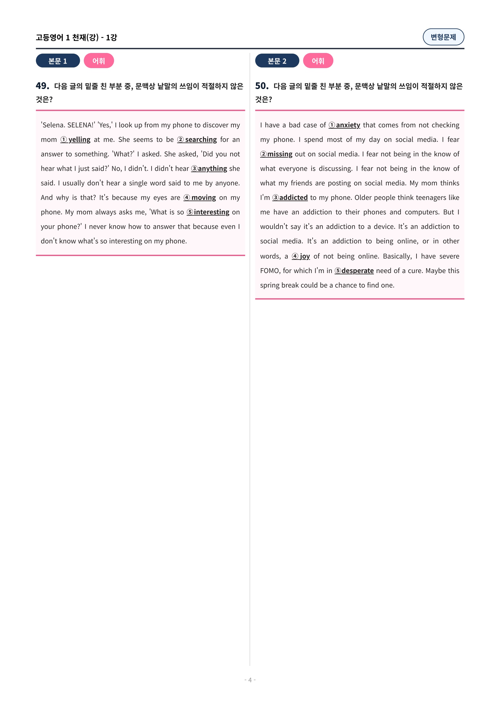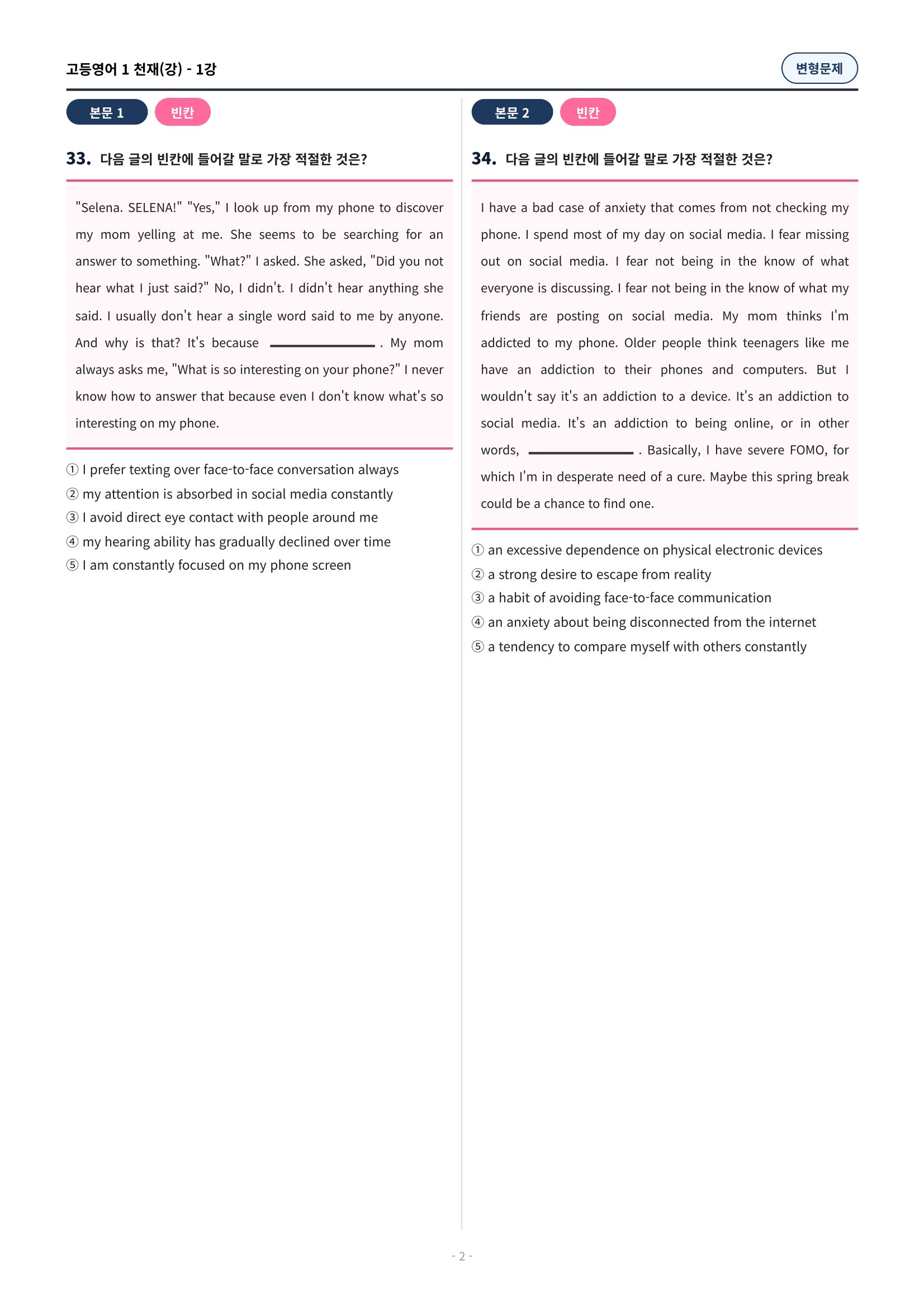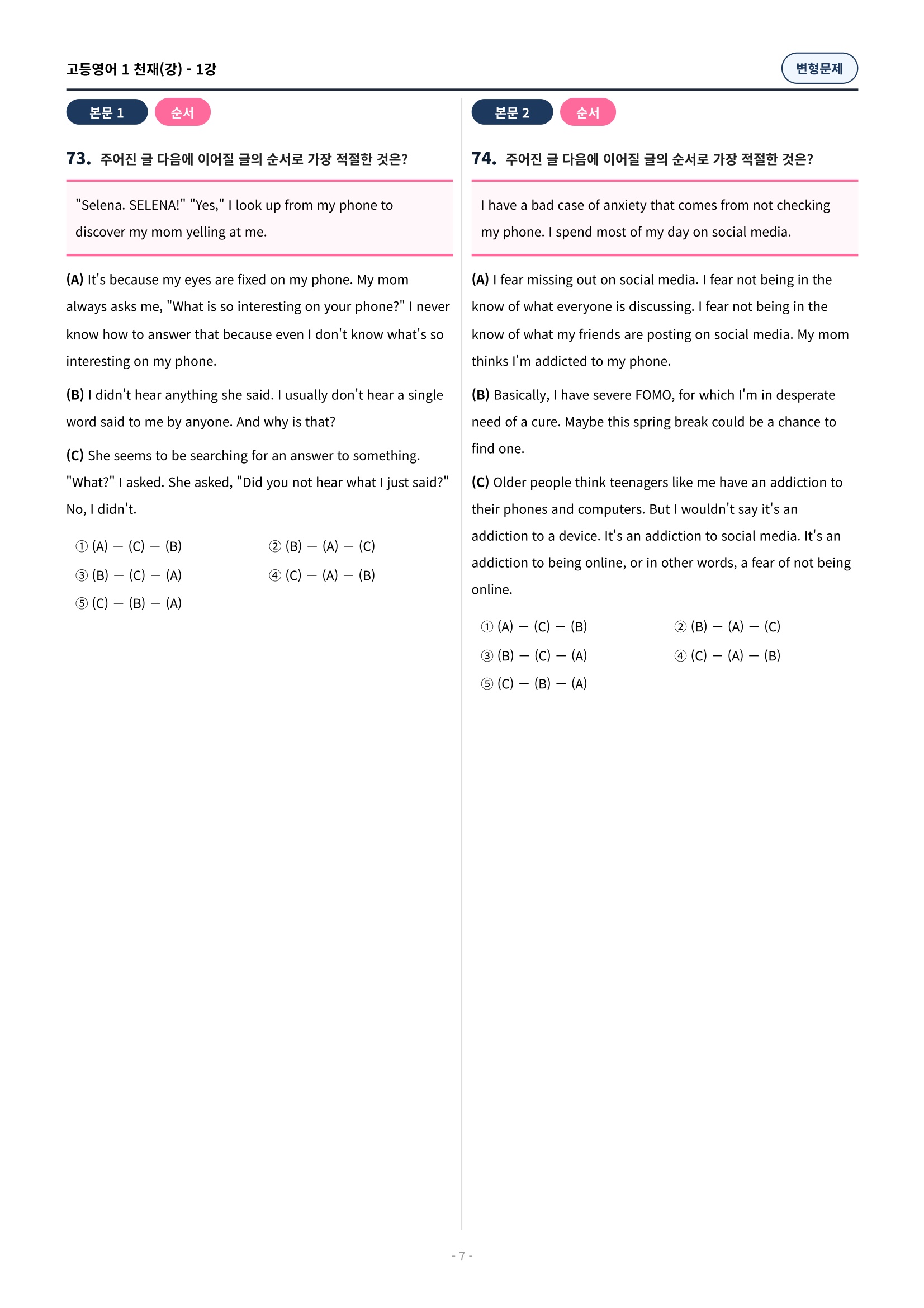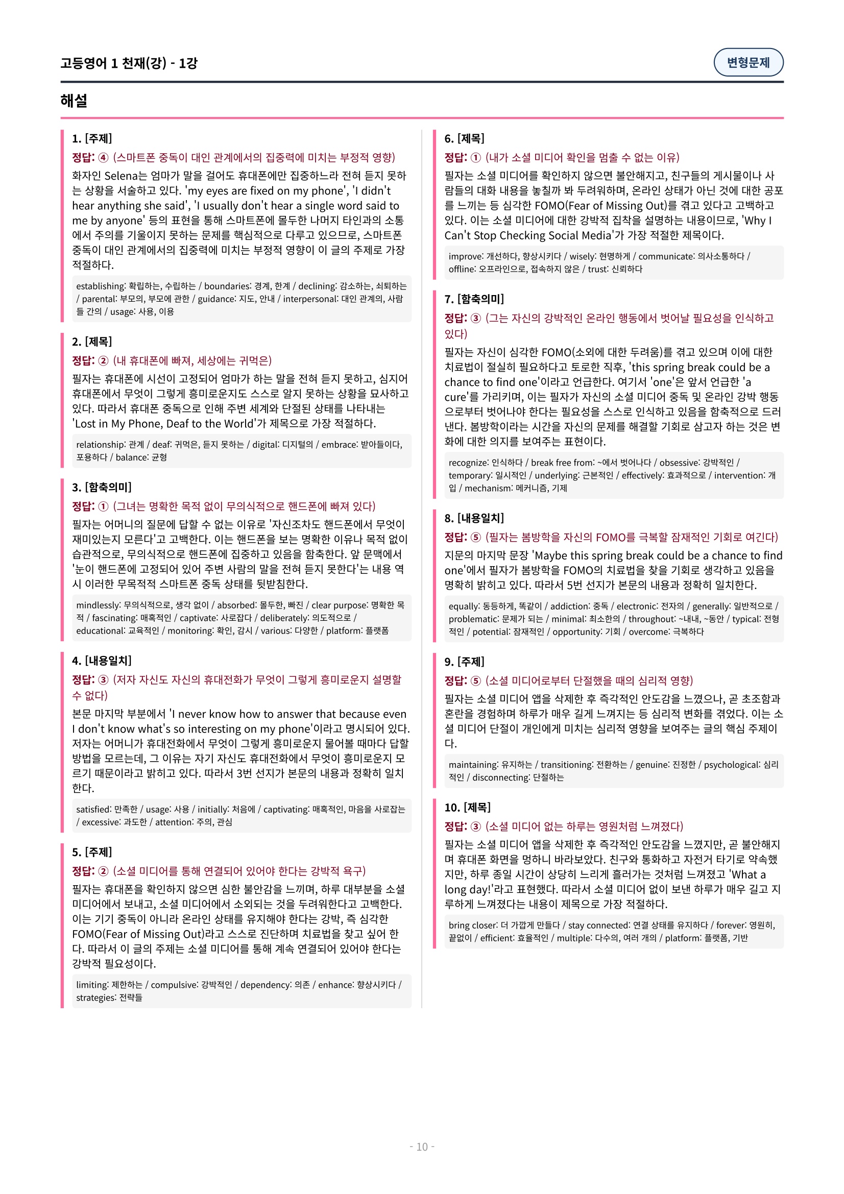 ๐ฉท[1๊ณผ][๊ณ ๋ฑ์์ด1] ์ฒ์ฌ(๊ฐ) ๋ณํ๋ฌธ์ (122์ )๐ฉท