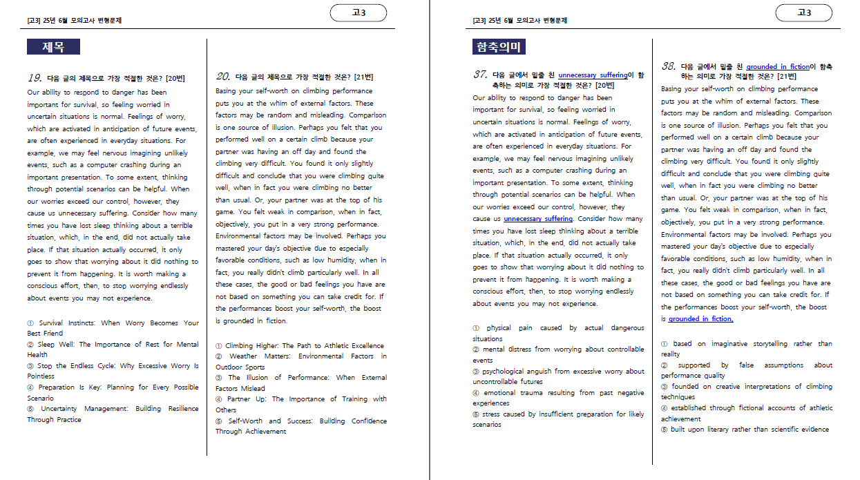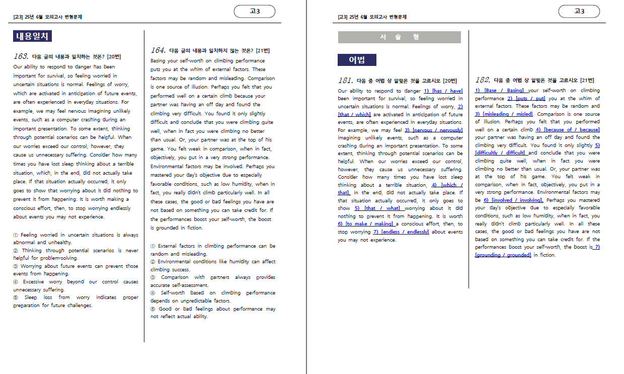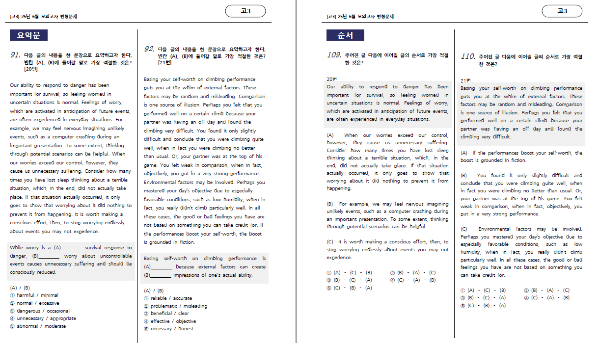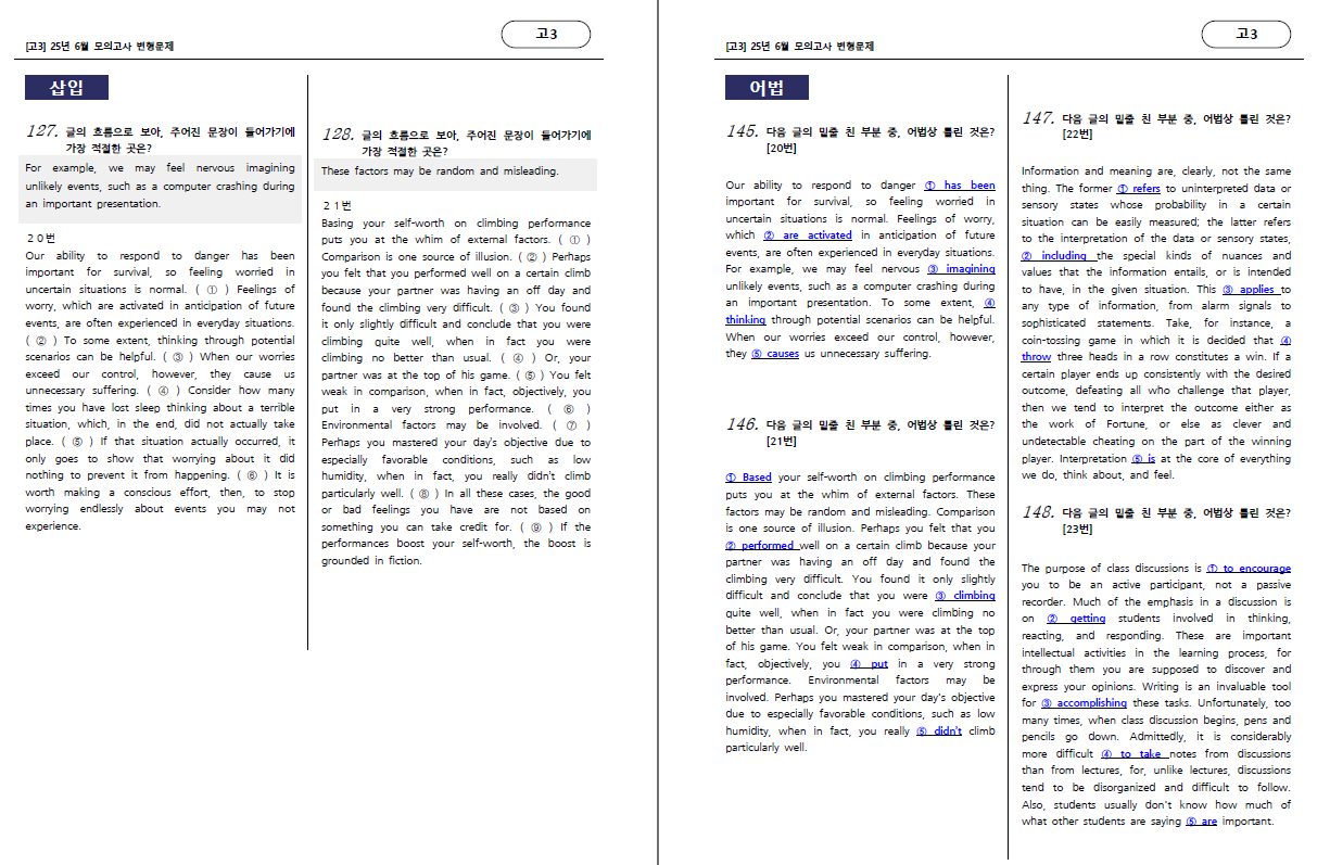 (유형편) : 주제, 제목, 밑줄함의, 어휘, 어법, 요약문, 빈칸, 내용일치, 순서, 삽입, 서술형 영작